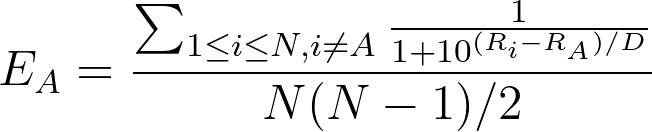 Let’s use standard Elo to compute all pairwise expected scores using the formula from the previous section. Then we’ll sum each player’s individual expected scores to get a total expected score for each player. Lastly, we’ll scale the scores so that they sum to 1 across all players (allowing us to interpret the scores as probabilities, like we do in standard Elo). In mathematical terms, our expected score for player A looks like this: